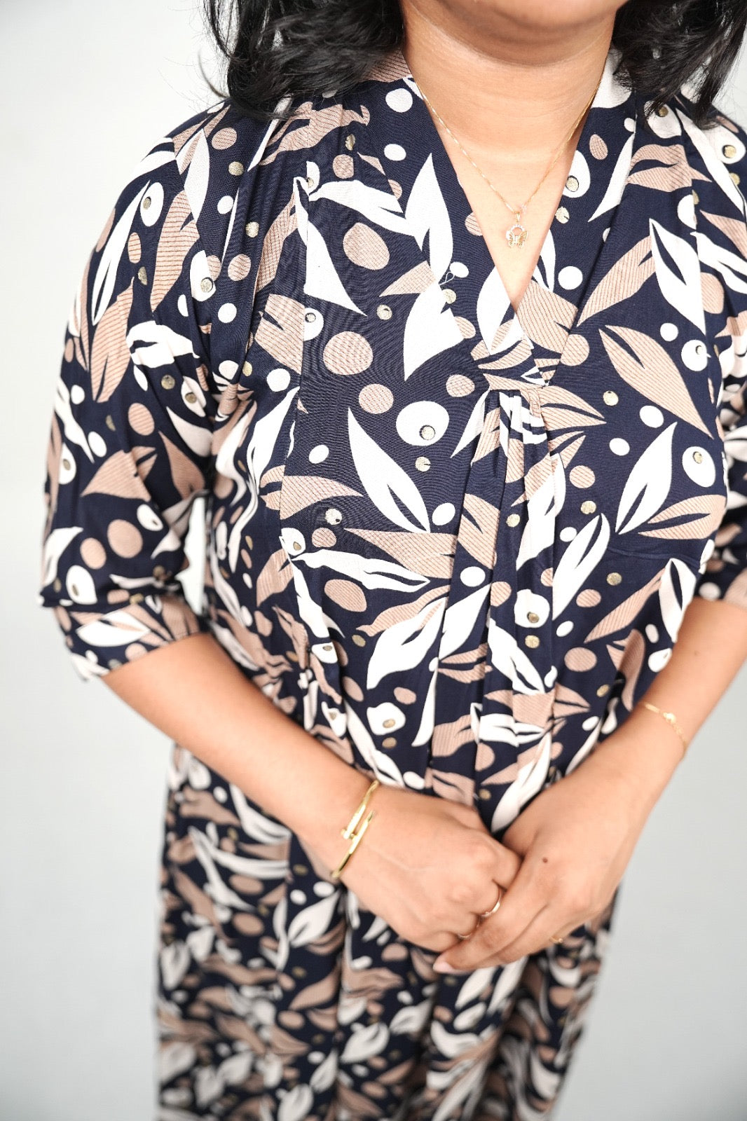| Nursing Access | Two hidden vertical zippers (concealed in pleats) |