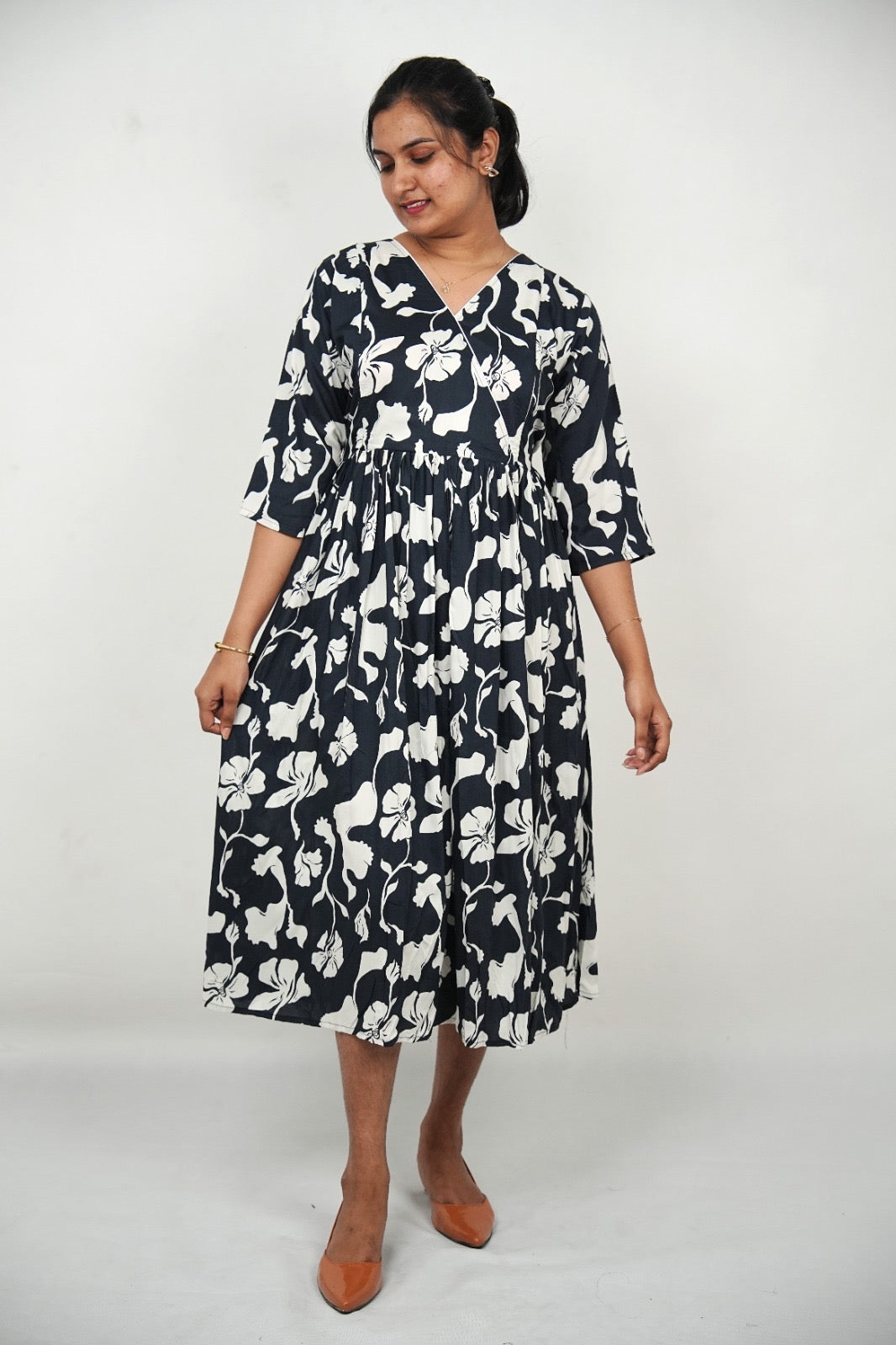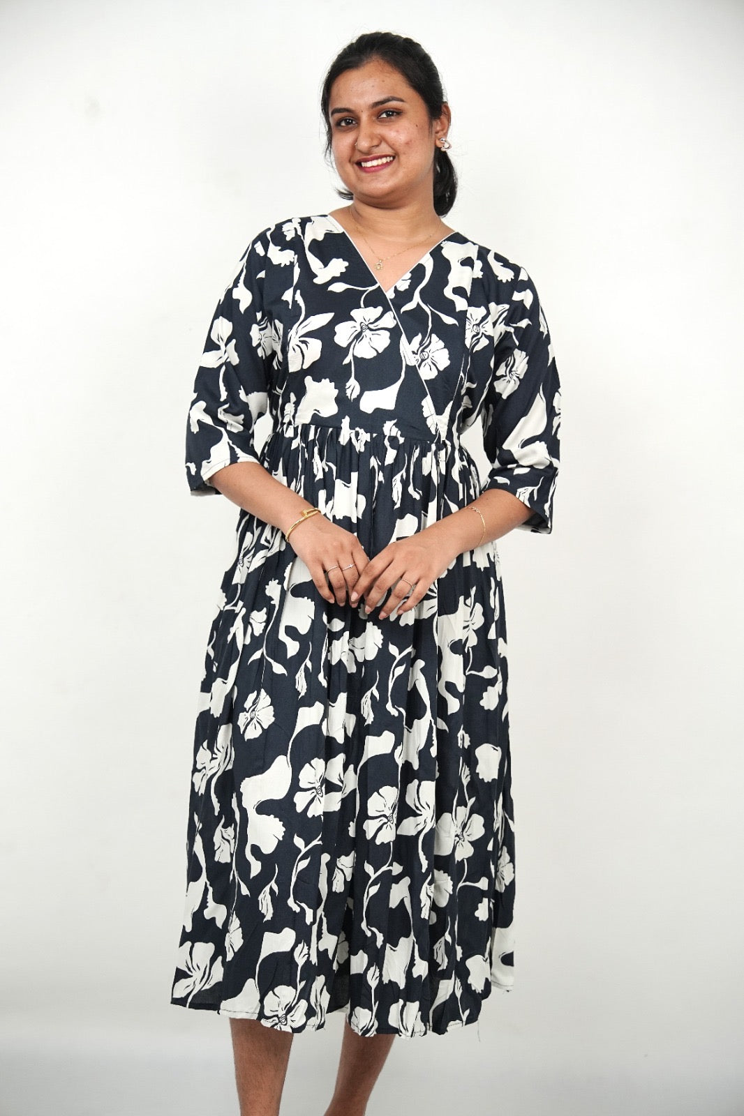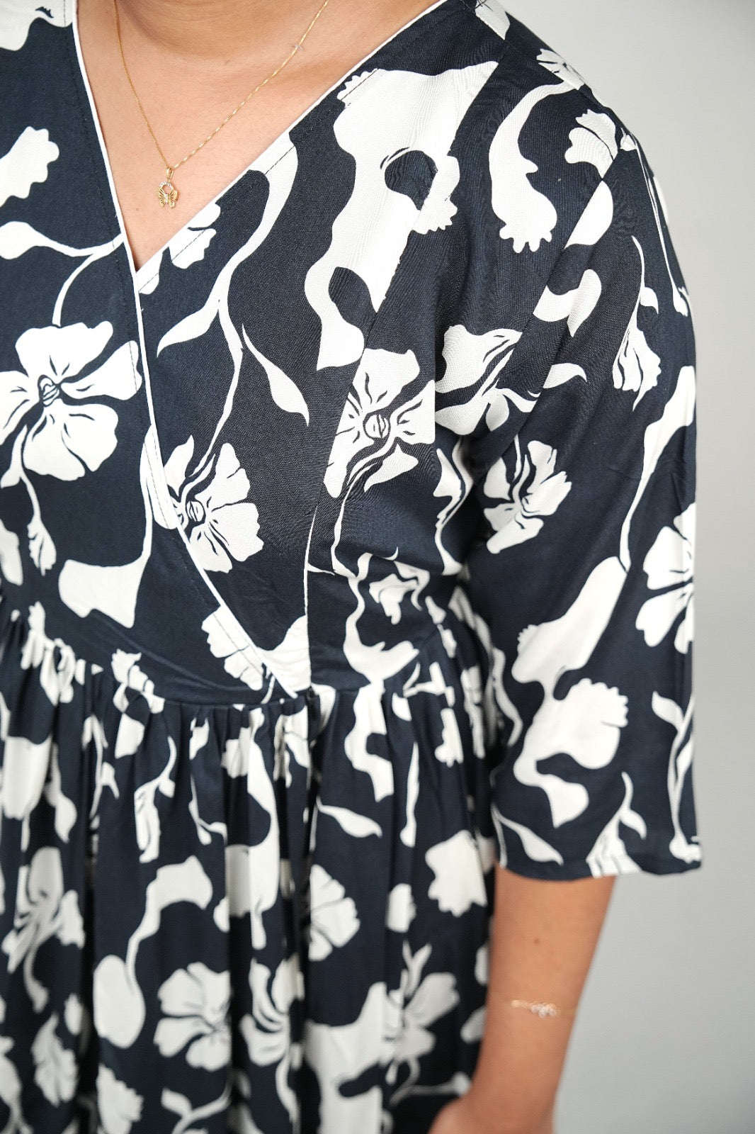 | Color/Print | Navy Blue with Bold White Floral Motifs |