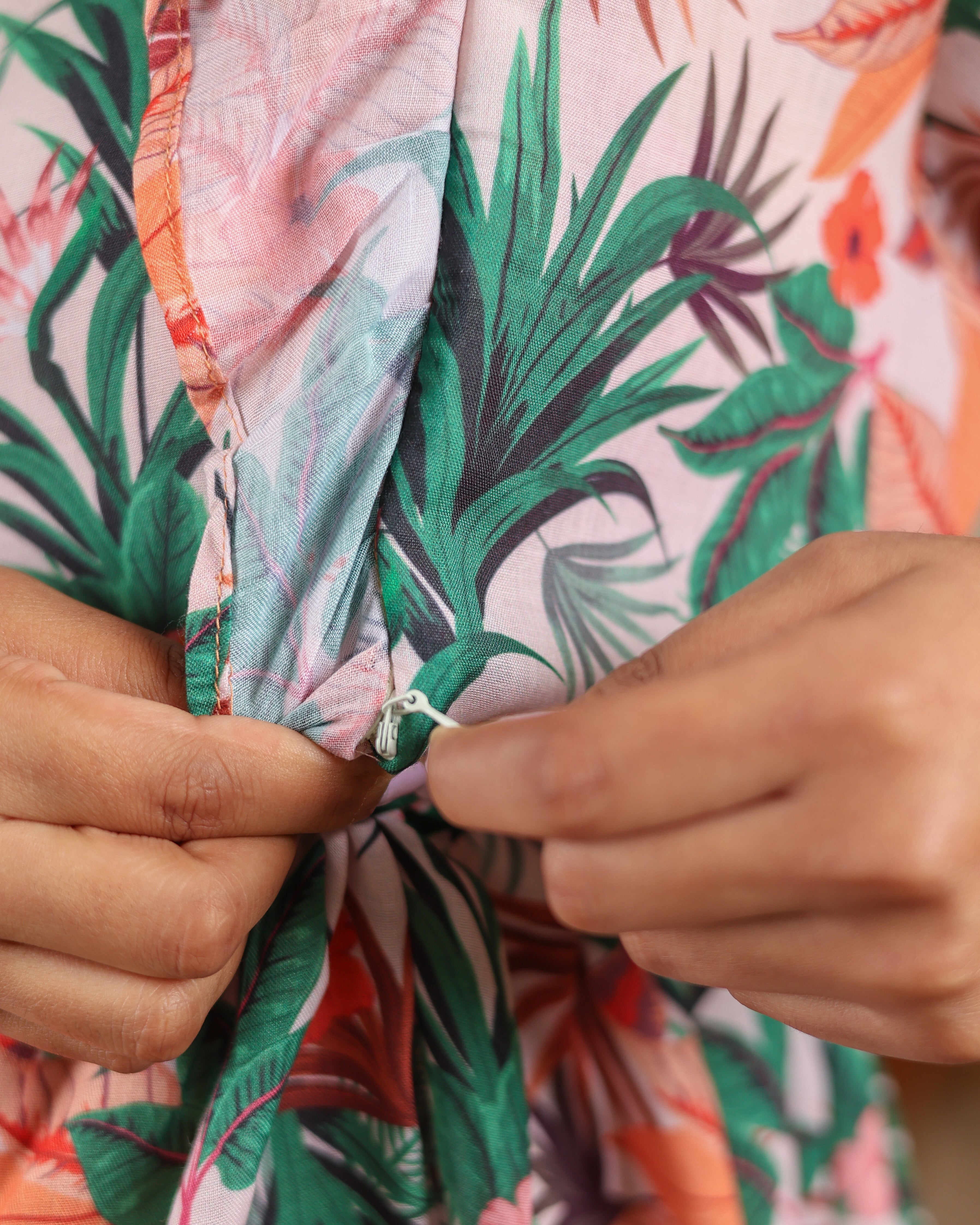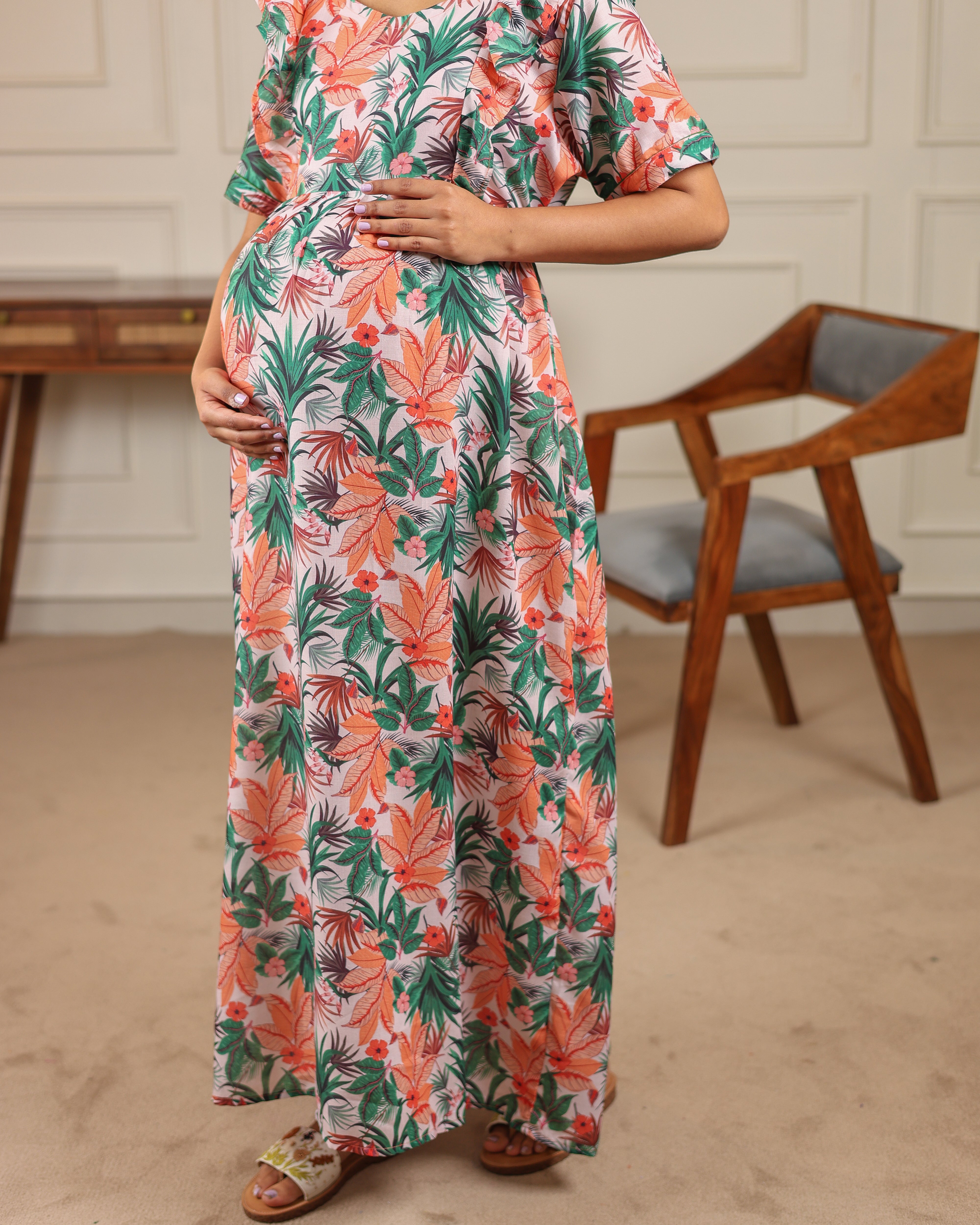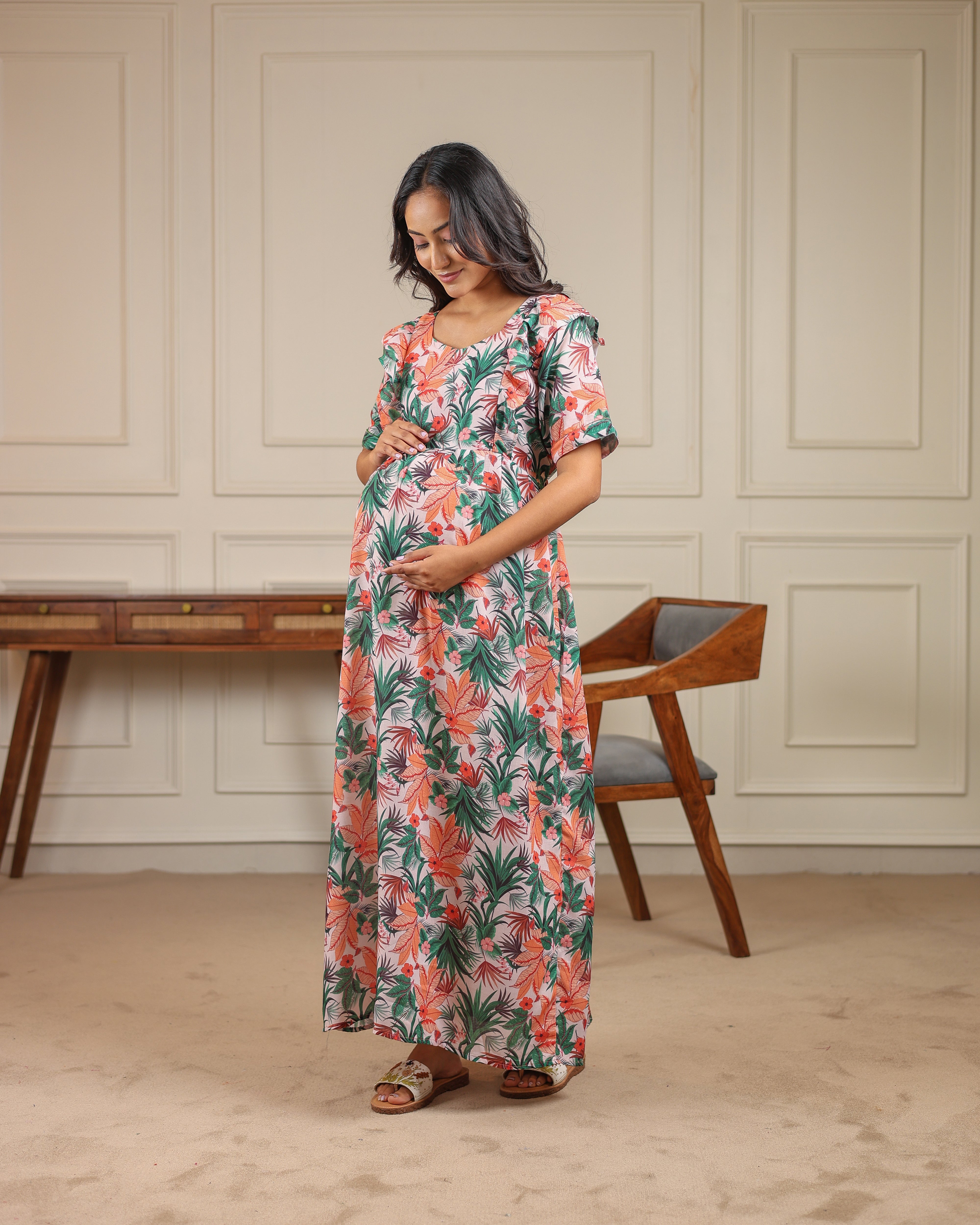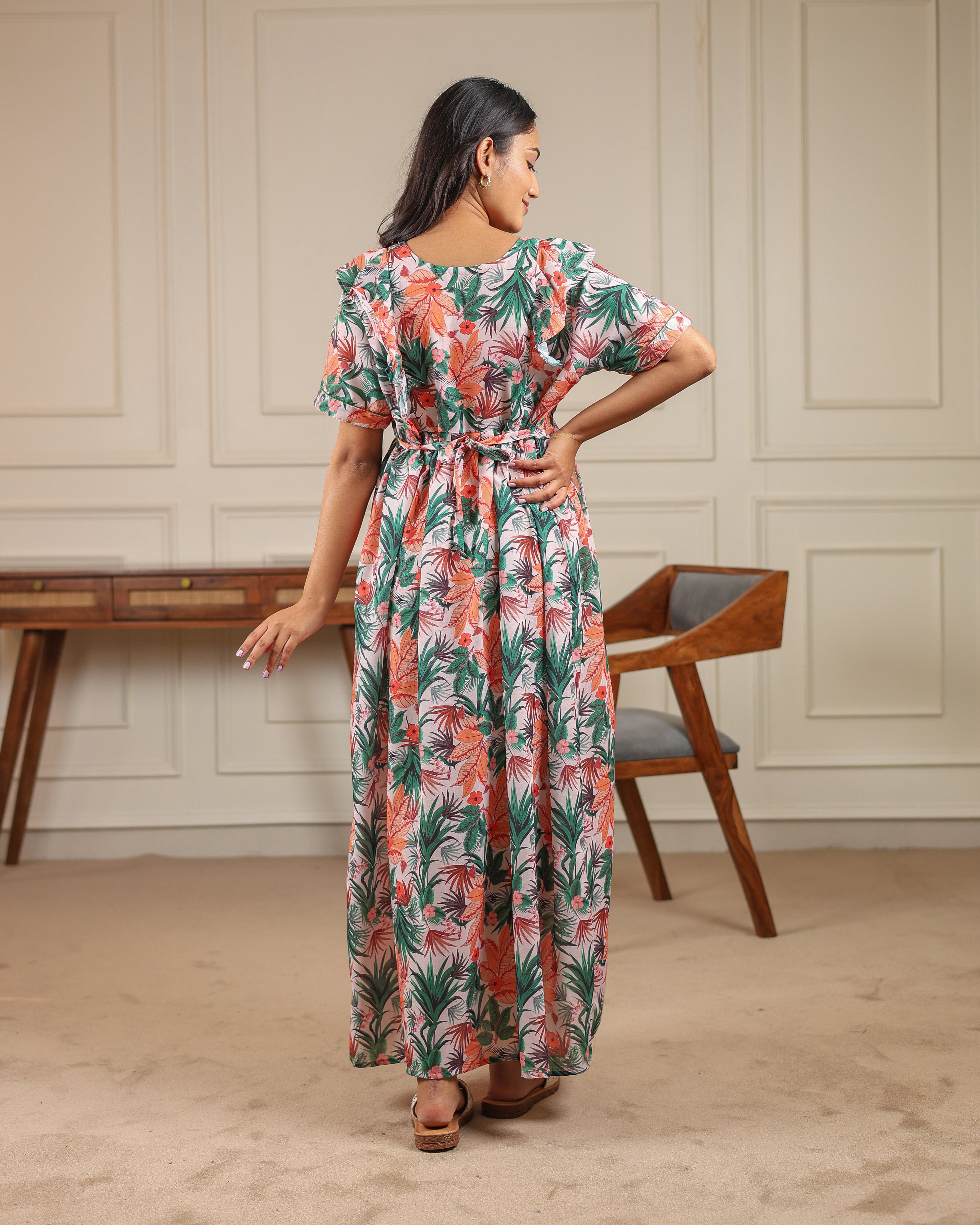 Embrace nature-inspired comfort with Eden. This dress showcases a lush tropical leaf print that brings a fresh, organic vibe to your daily wear. Made for the modern mother, Eden features high-quality Cambric cotton and discreet zippers for breastfeeding. Whether you’re resting at home or enjoying a quiet morning, its flowing free-size fit and frilled sleeves offer effortless elegance.