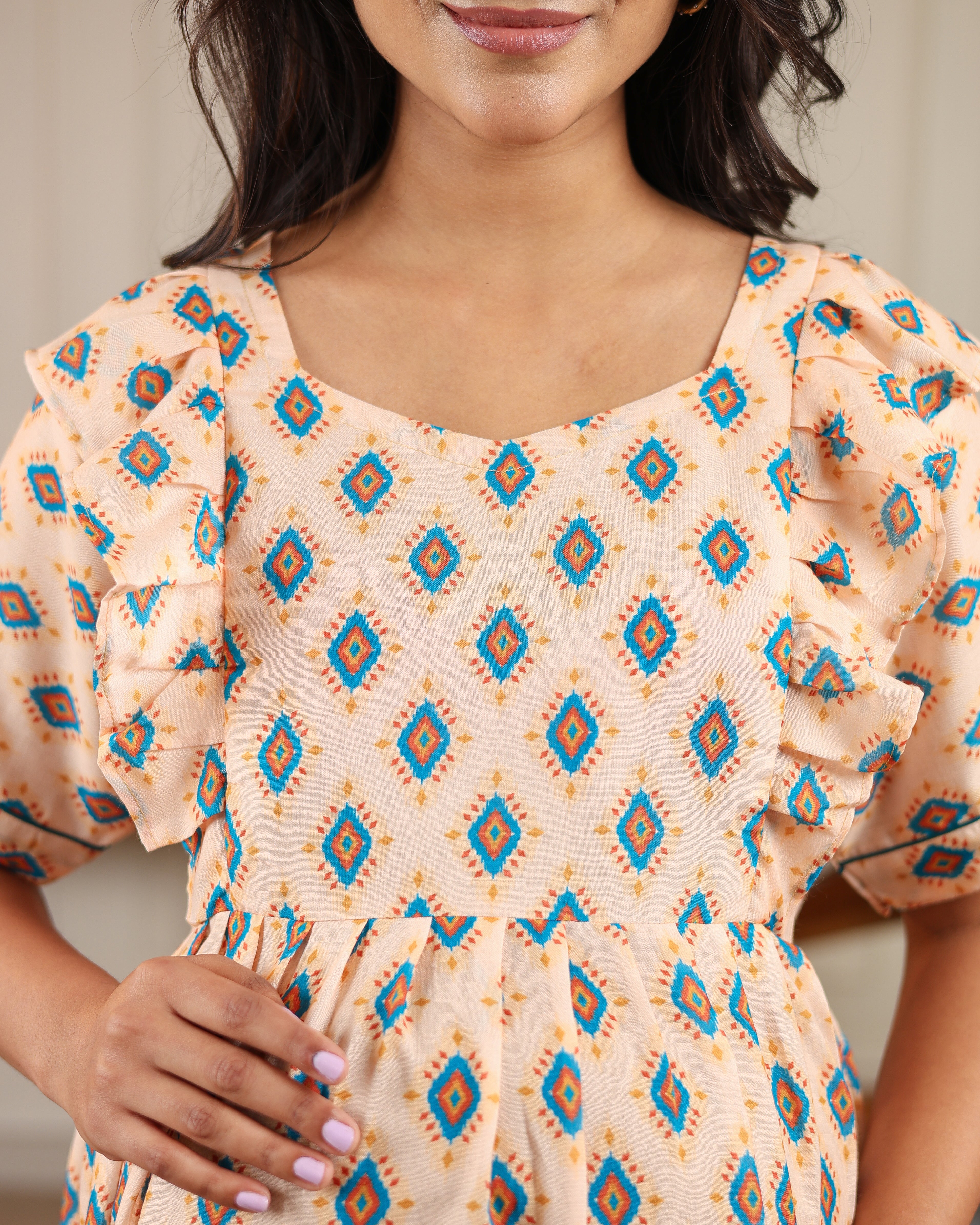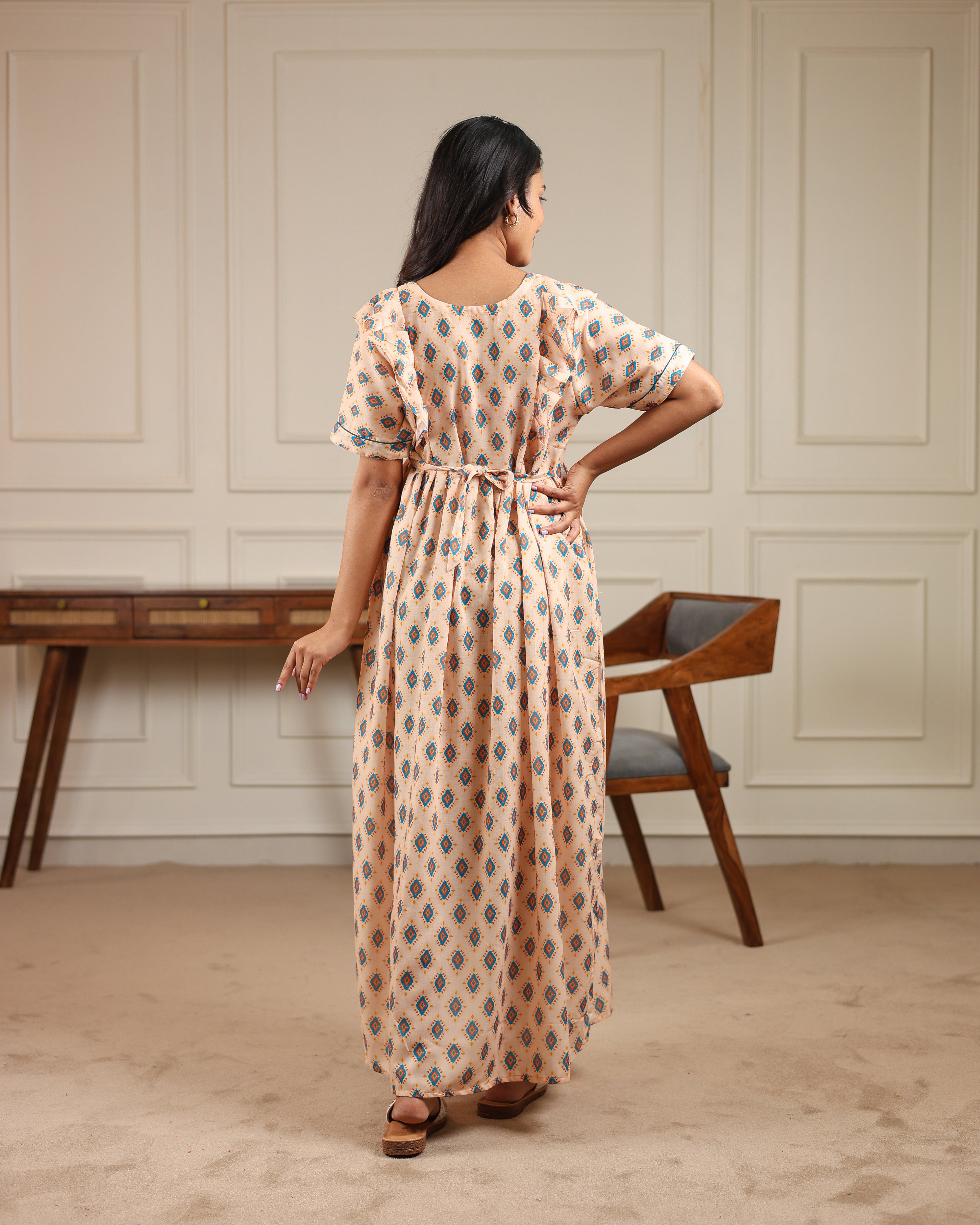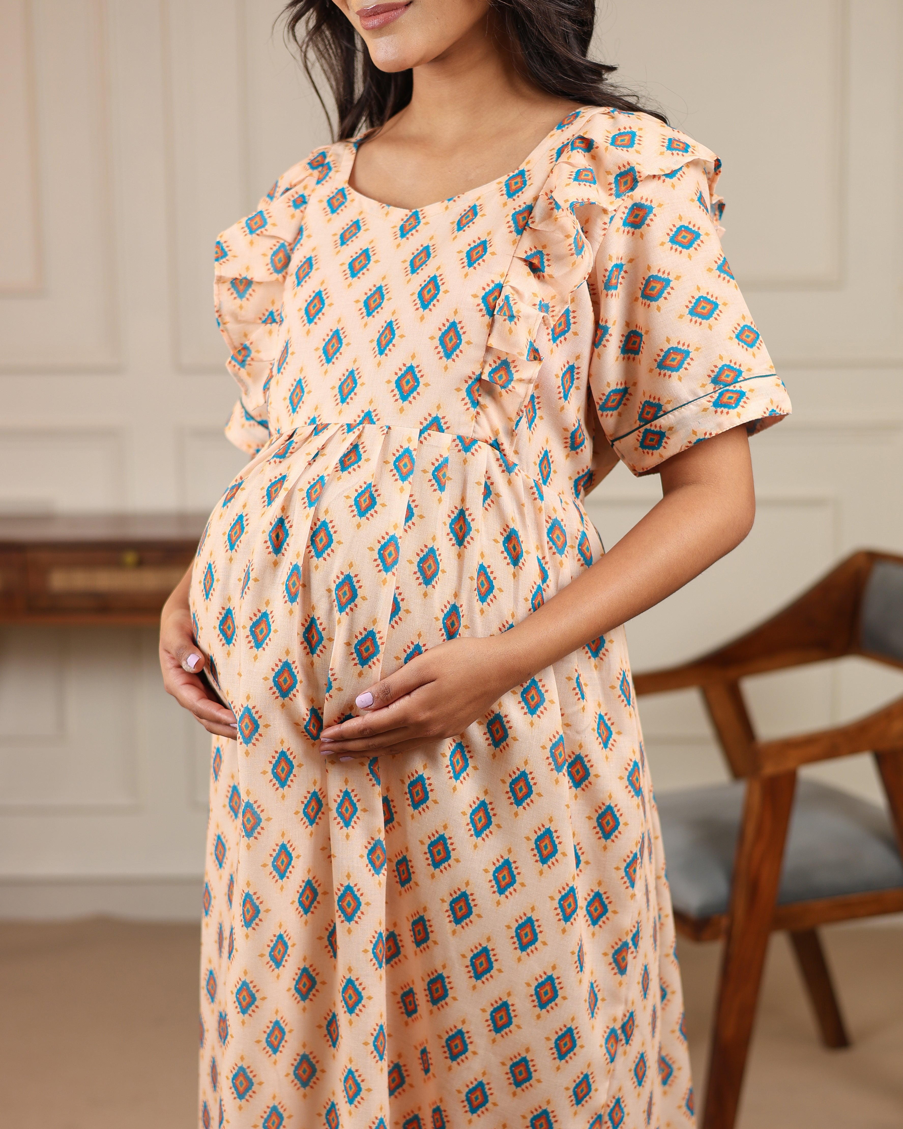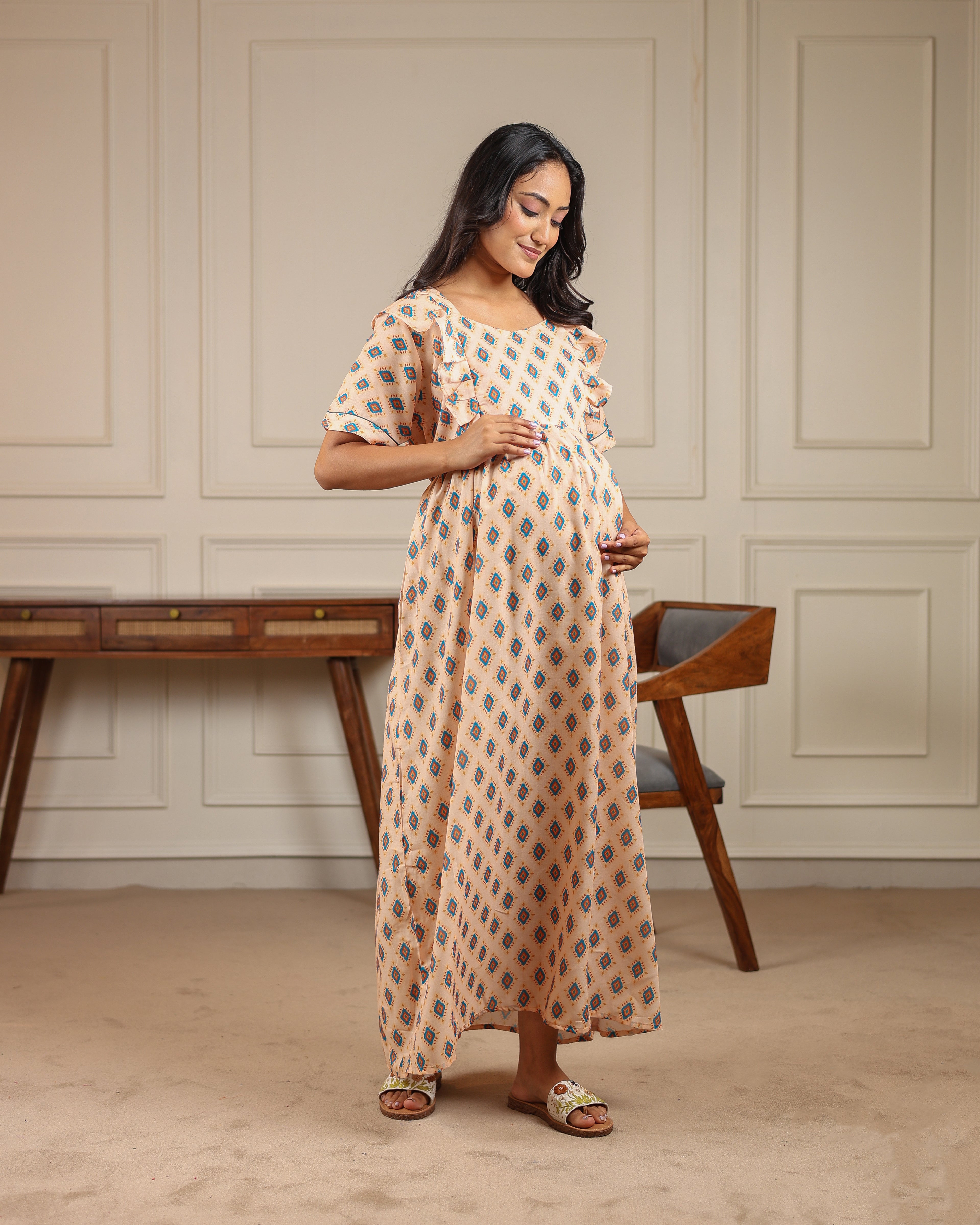 Discover the perfect balance of modern design and comfort with Terra. This peach-toned maxi is detailed with a subtle geometric diamond print, offering a unique look for your maternity collection. The premium Cambric cotton keeps you cool, while the hidden nursing access provides the convenience you need postpartum. With its airy free-size cut and frill accents, Terra is built for ultimate comfort.