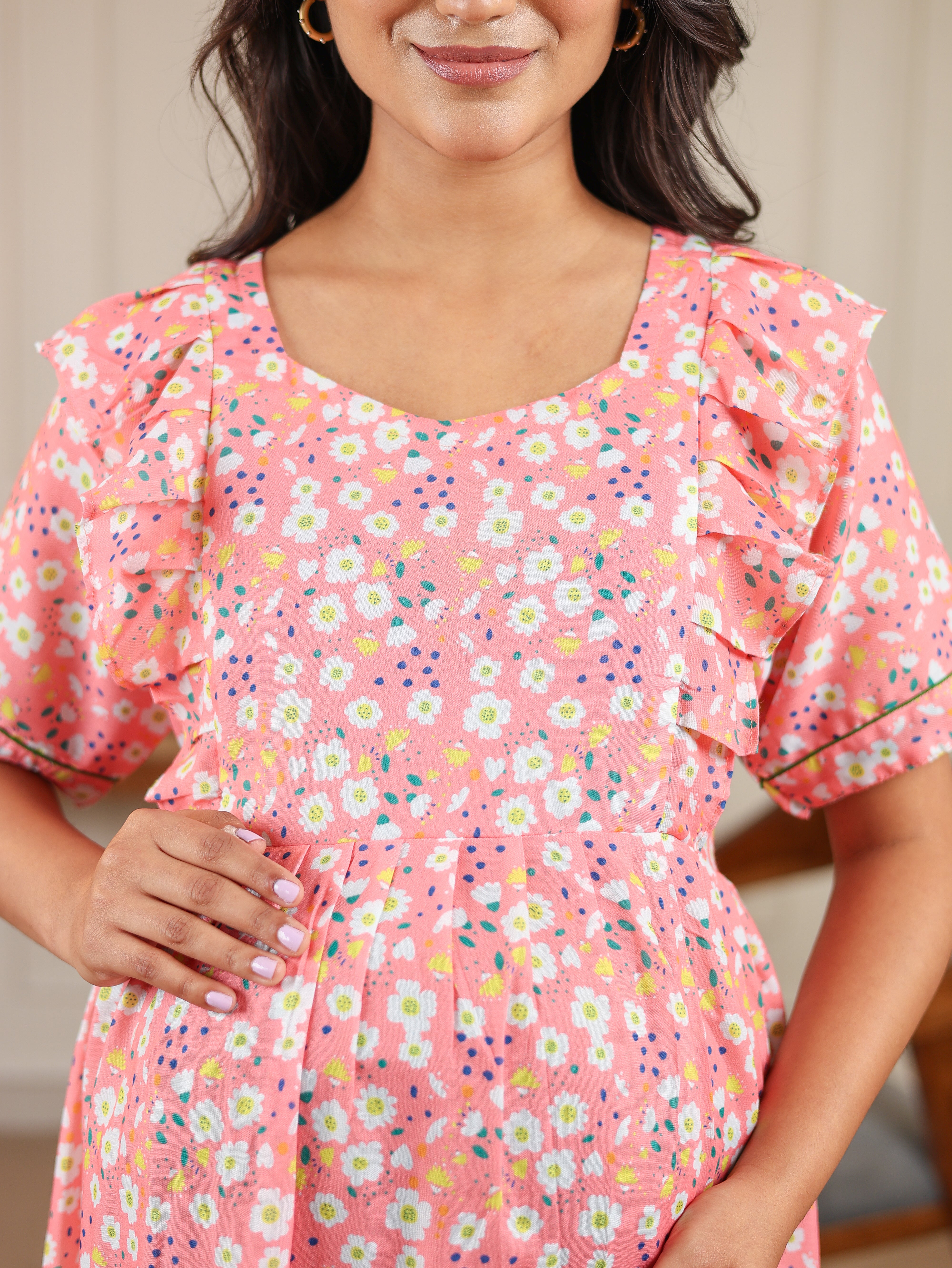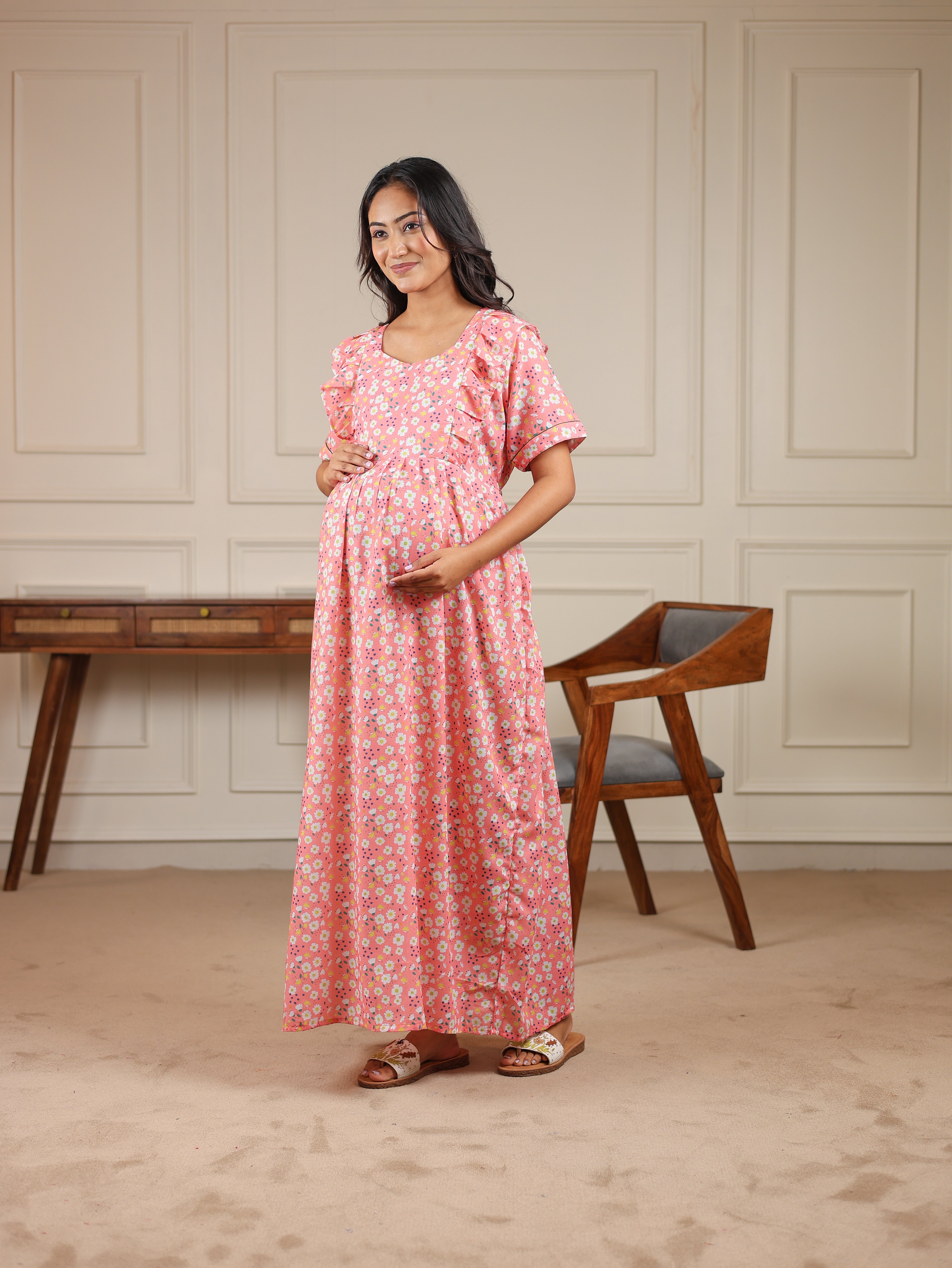 Soft, sweet, and incredibly comfortable, Blush is a celebration of motherhood. Adorned with a dainty white daisy print on a lovely pink backdrop, this premium Cambric cotton gown is a dream to wear. It features hidden zippers for easy nursing and stylish frill sleeves. The free-size design ensures you stay comfortable from your first trimester through your nursing days.