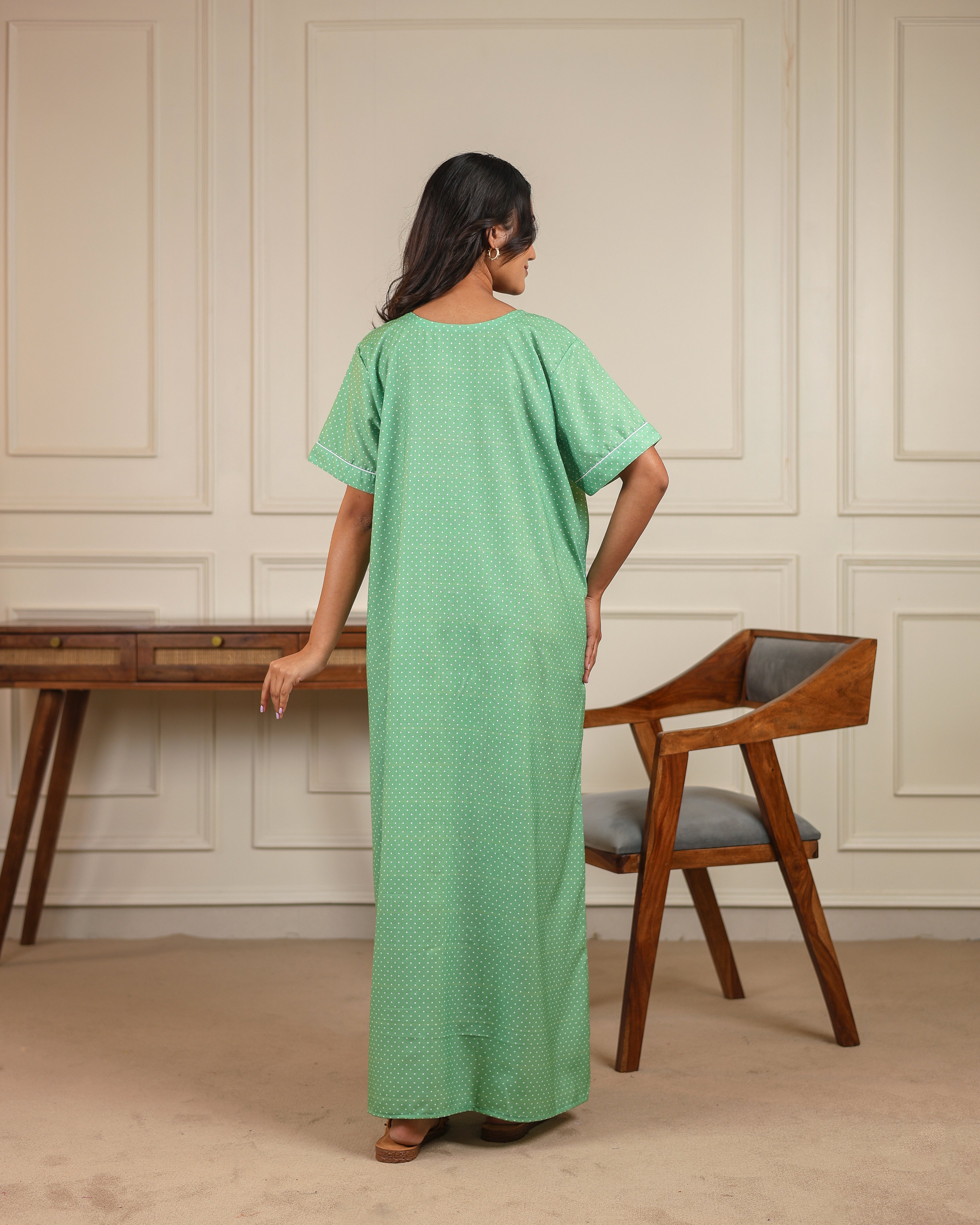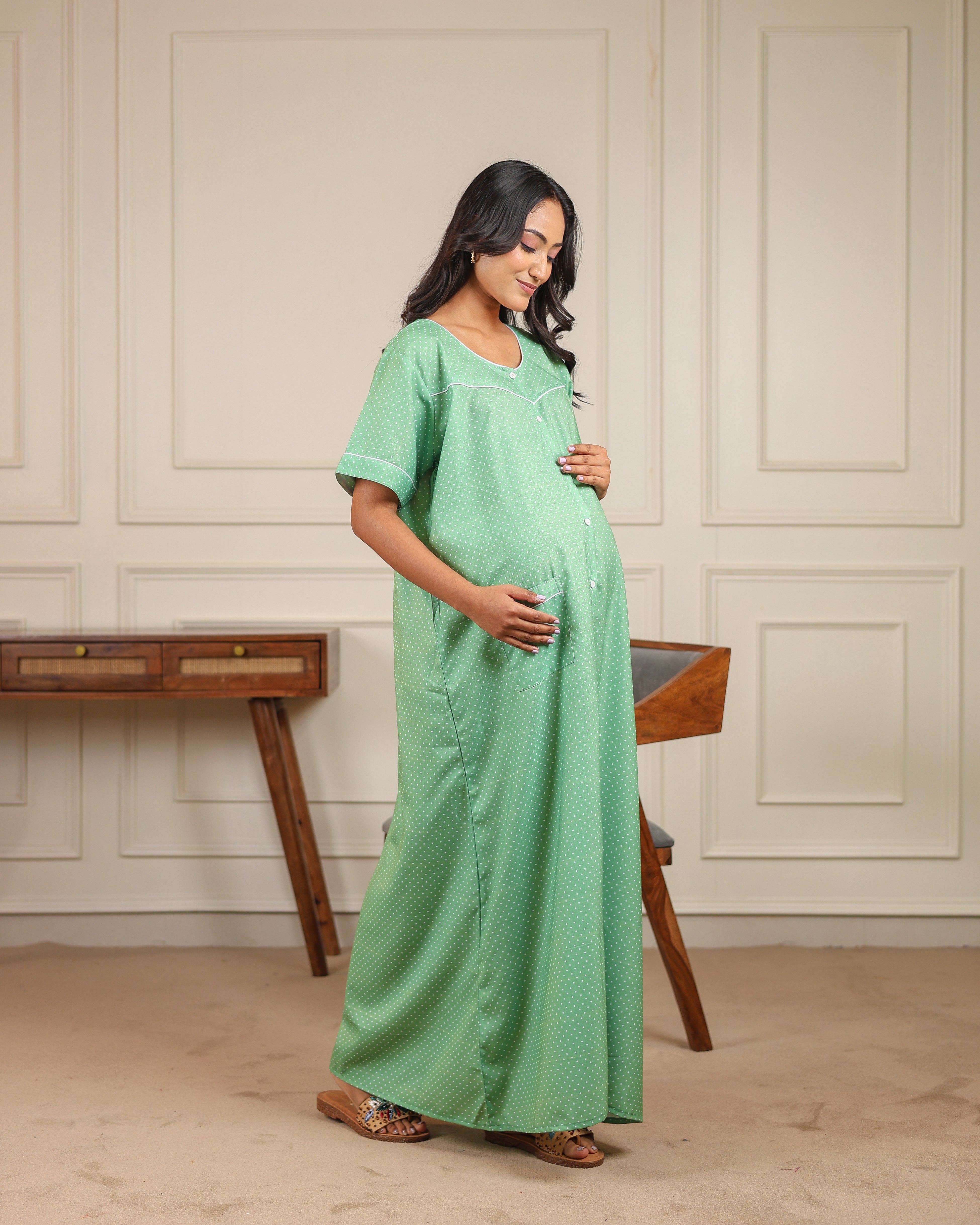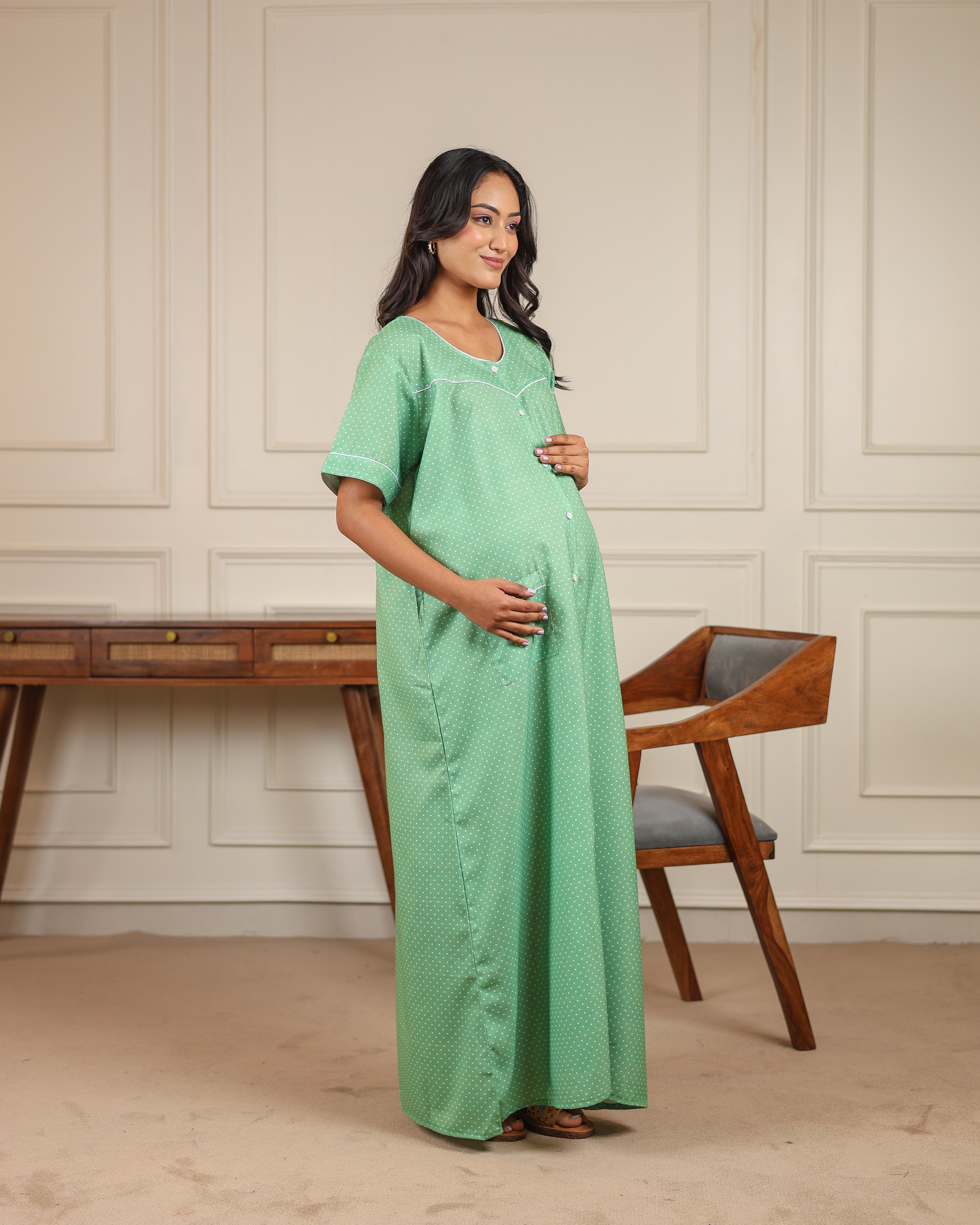Designed by She Wardrobe for the modern mother, this premium nightdress is the ultimate essential for your maternity journey. Crafted from high-quality, ultra-soft cotton, it offers breathable comfort that adapts to your body from the first trimester through to postpartum recovery. The full-length silhouette provides elegant coverage, while the functional button-down front is thoughtfully designed for effortless nursing access. Featuring a convenient side pocket and contrast piping details, this gown ensures you feel as good as you look.