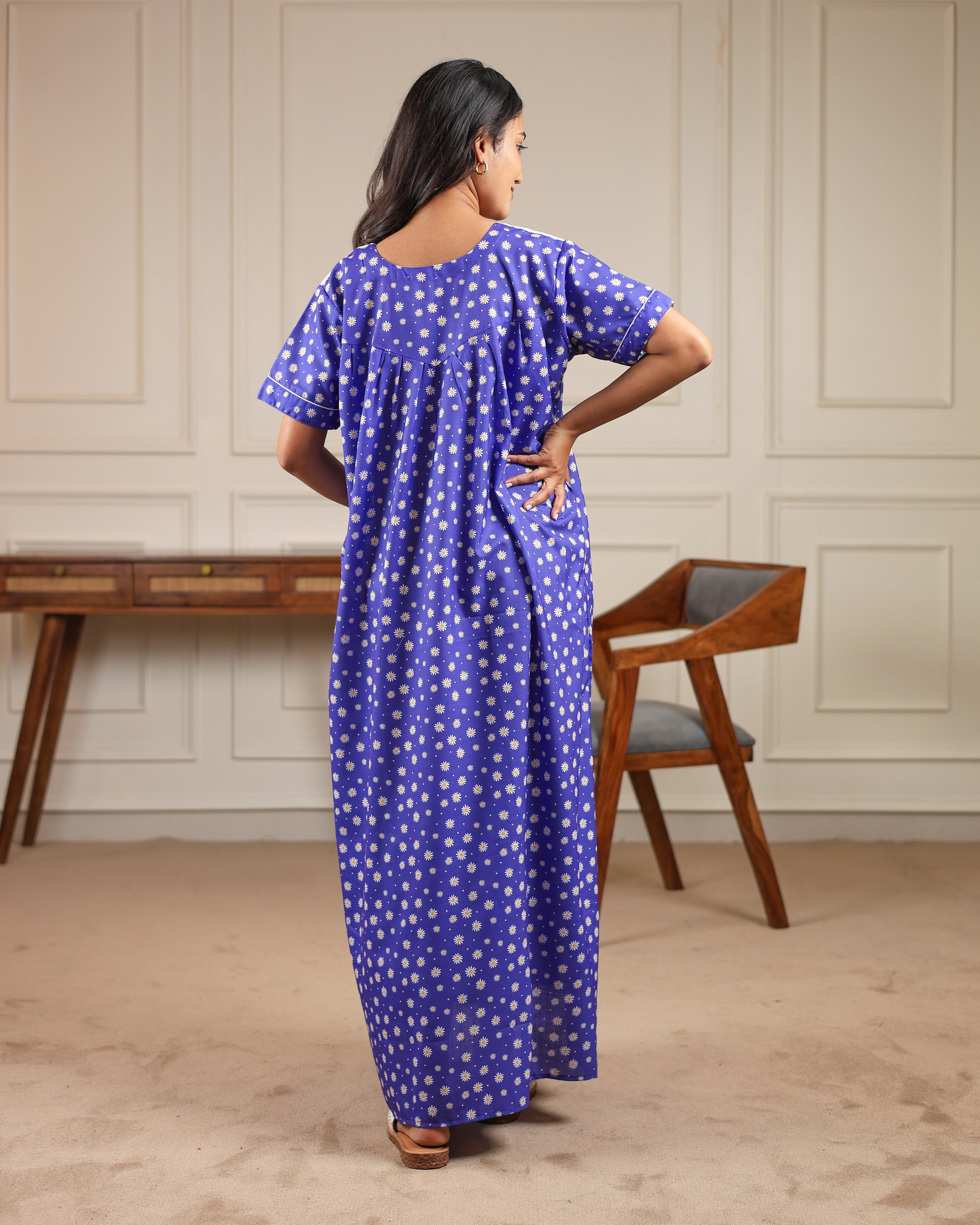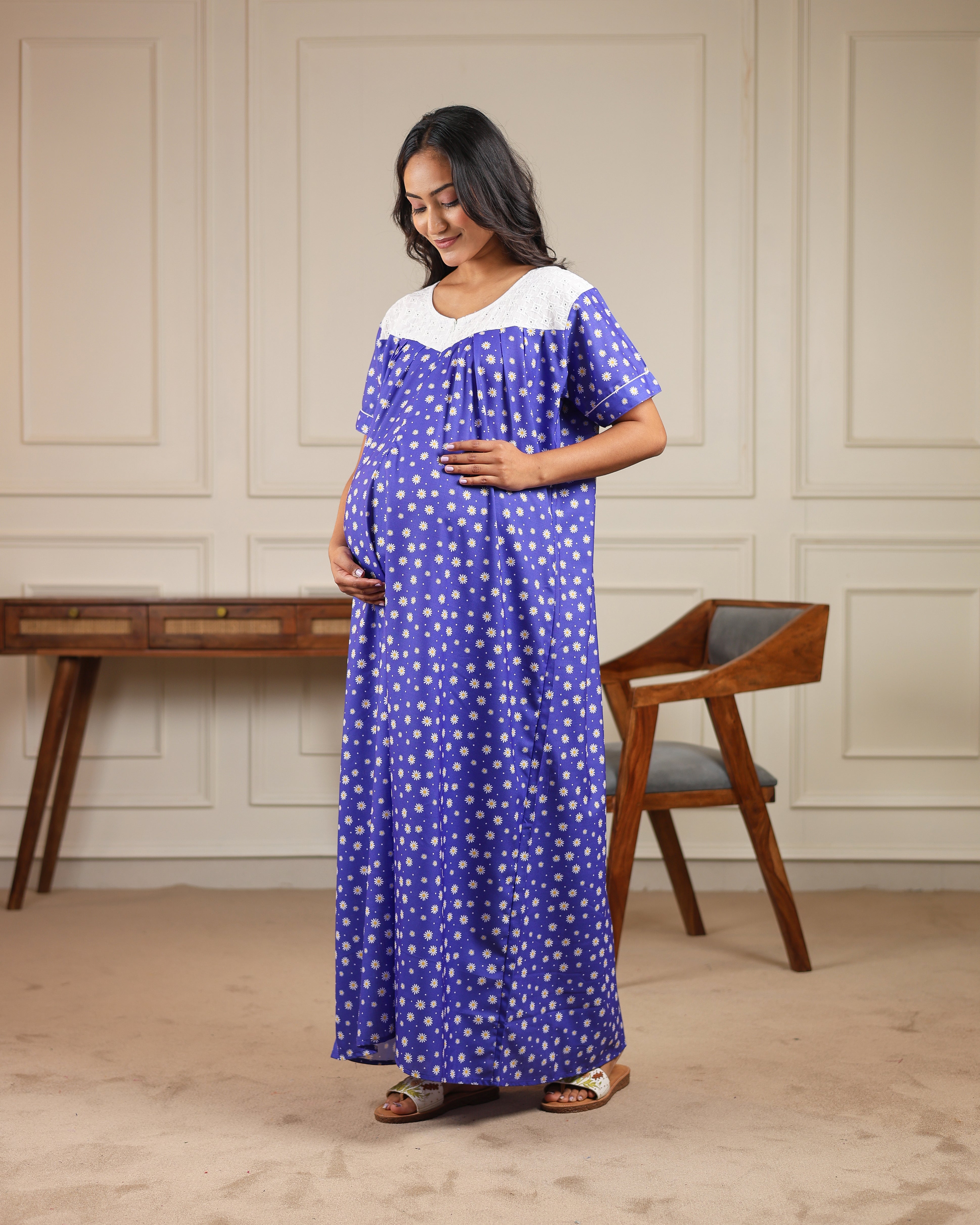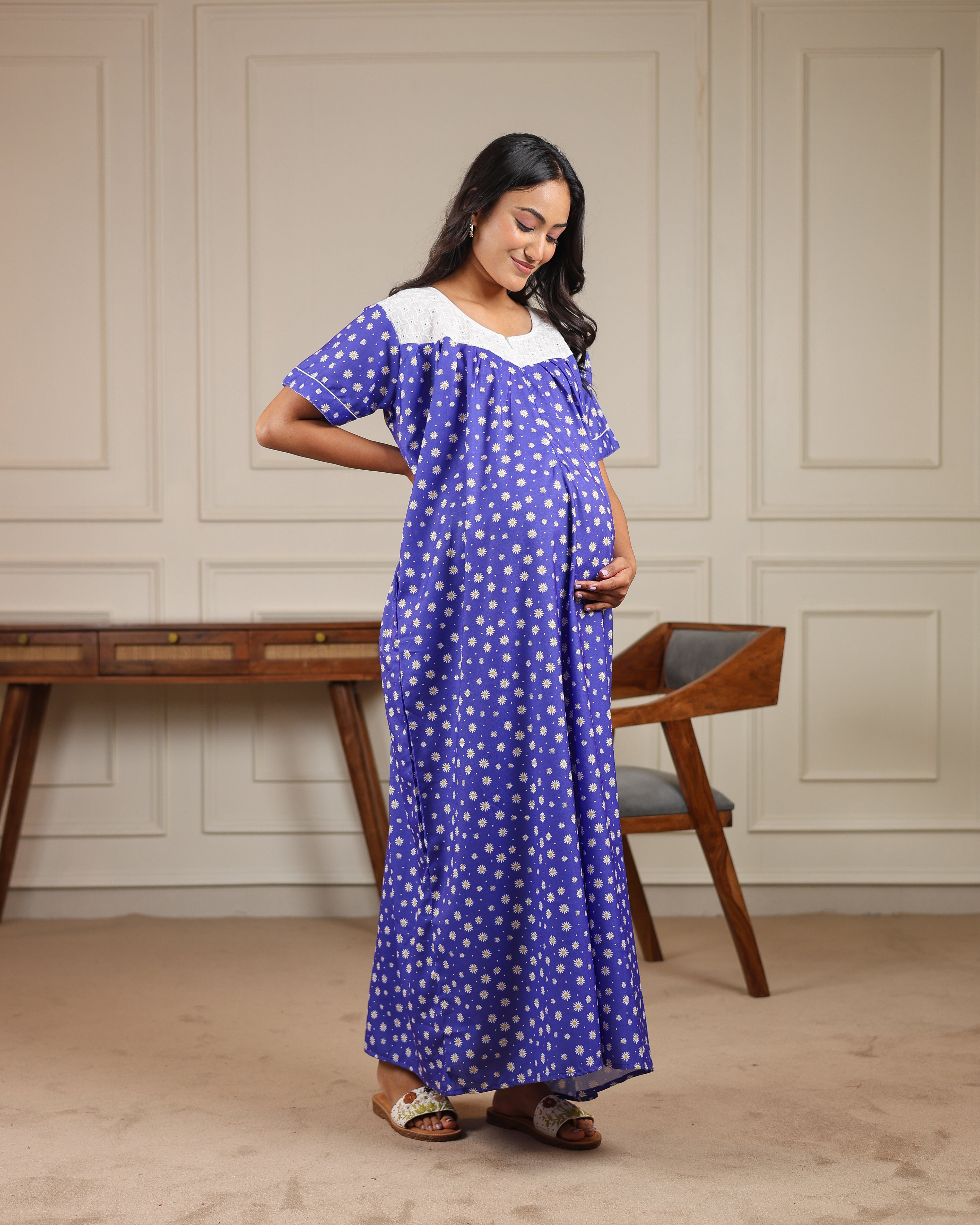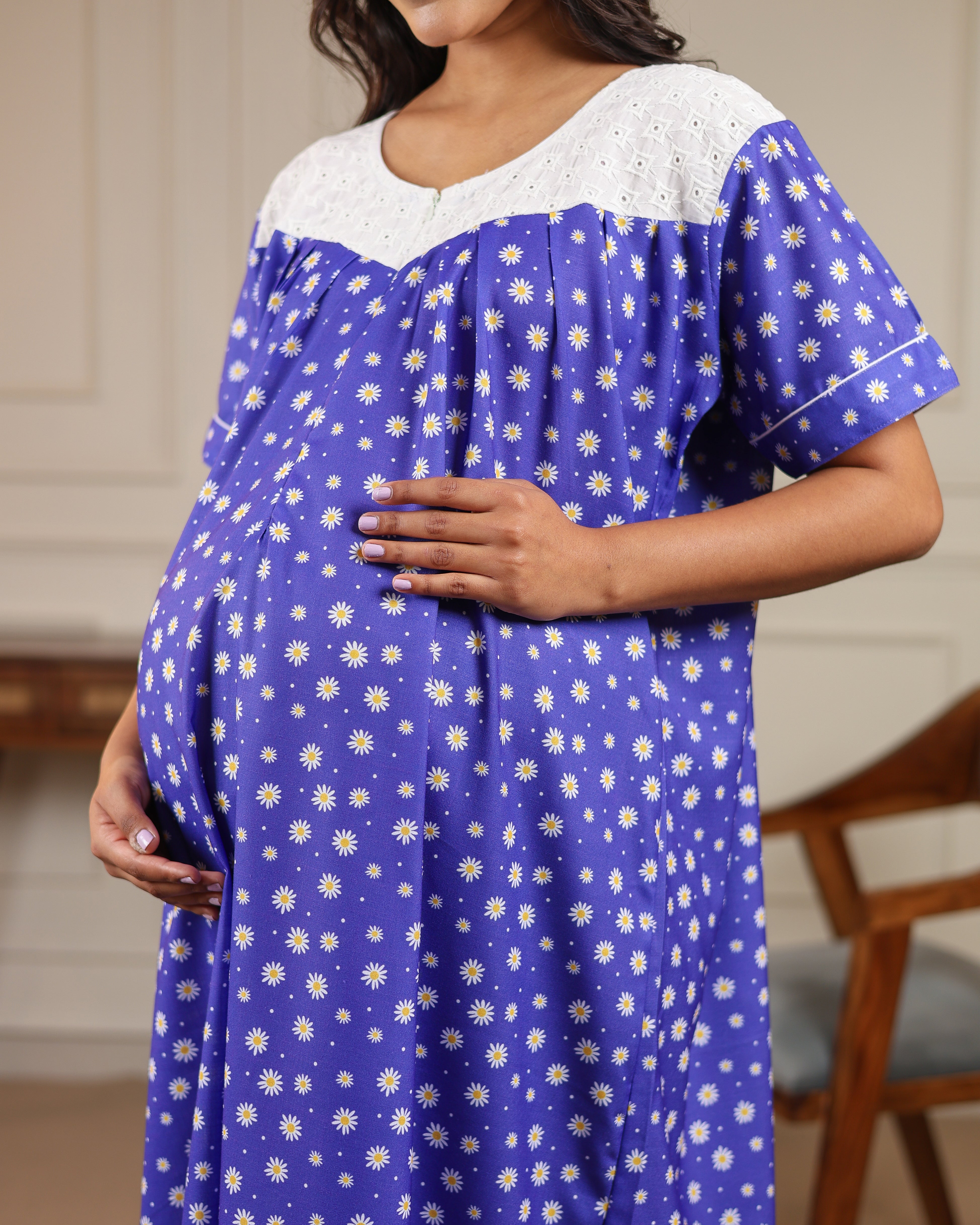 Daisy | She Wardrobe Lace Yoke Premium Cotton Maternity & Nursing Gown – Royal Blue