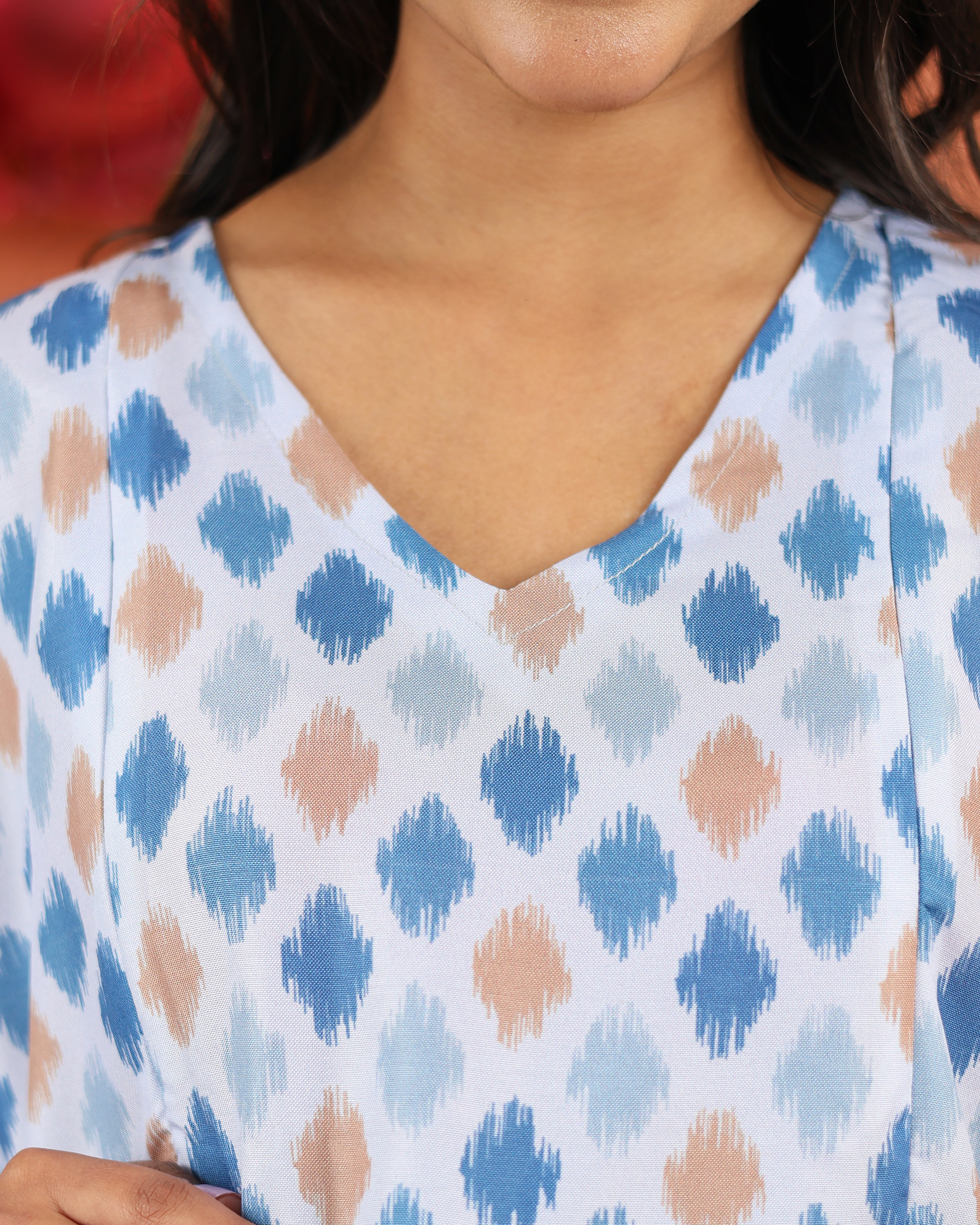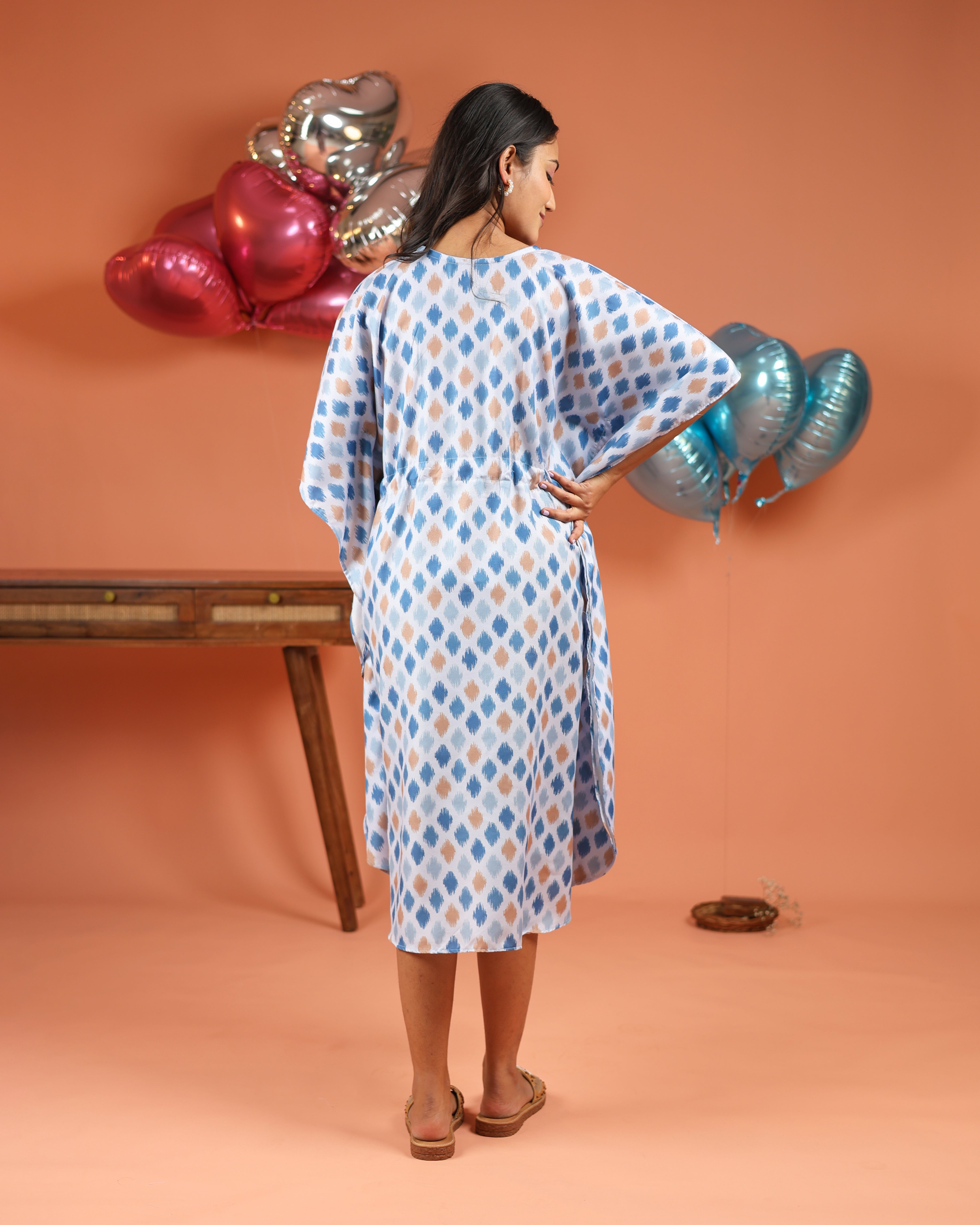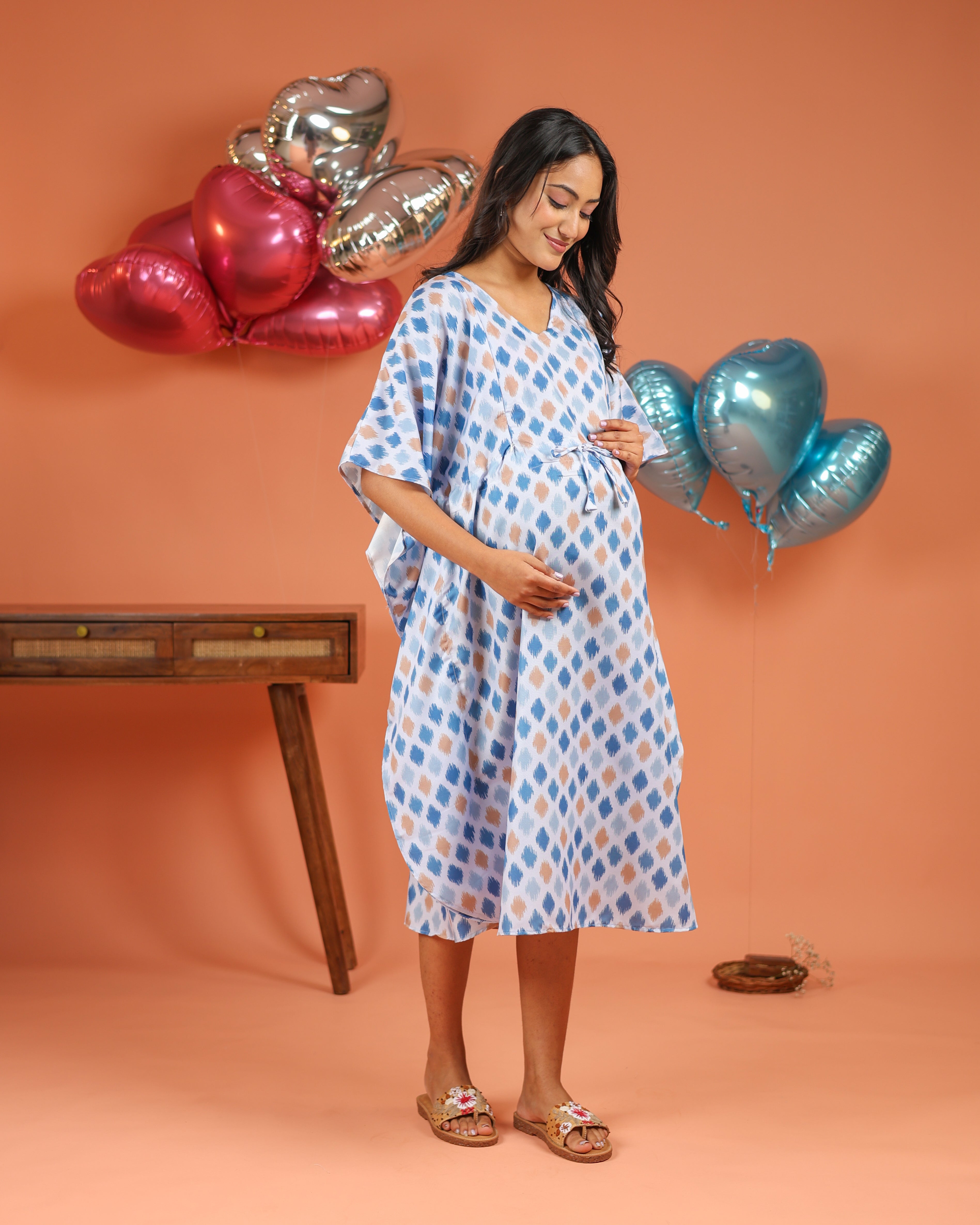 Kaya combines traditional Ikat aesthetics with modern maternity needs. This blue diamond-print Kaftan drapes beautifully over your curves. With its breathable fabric and hidden zippers on both sides, it’s the ultimate choice for stylish, stress-free breastfeeding at home.