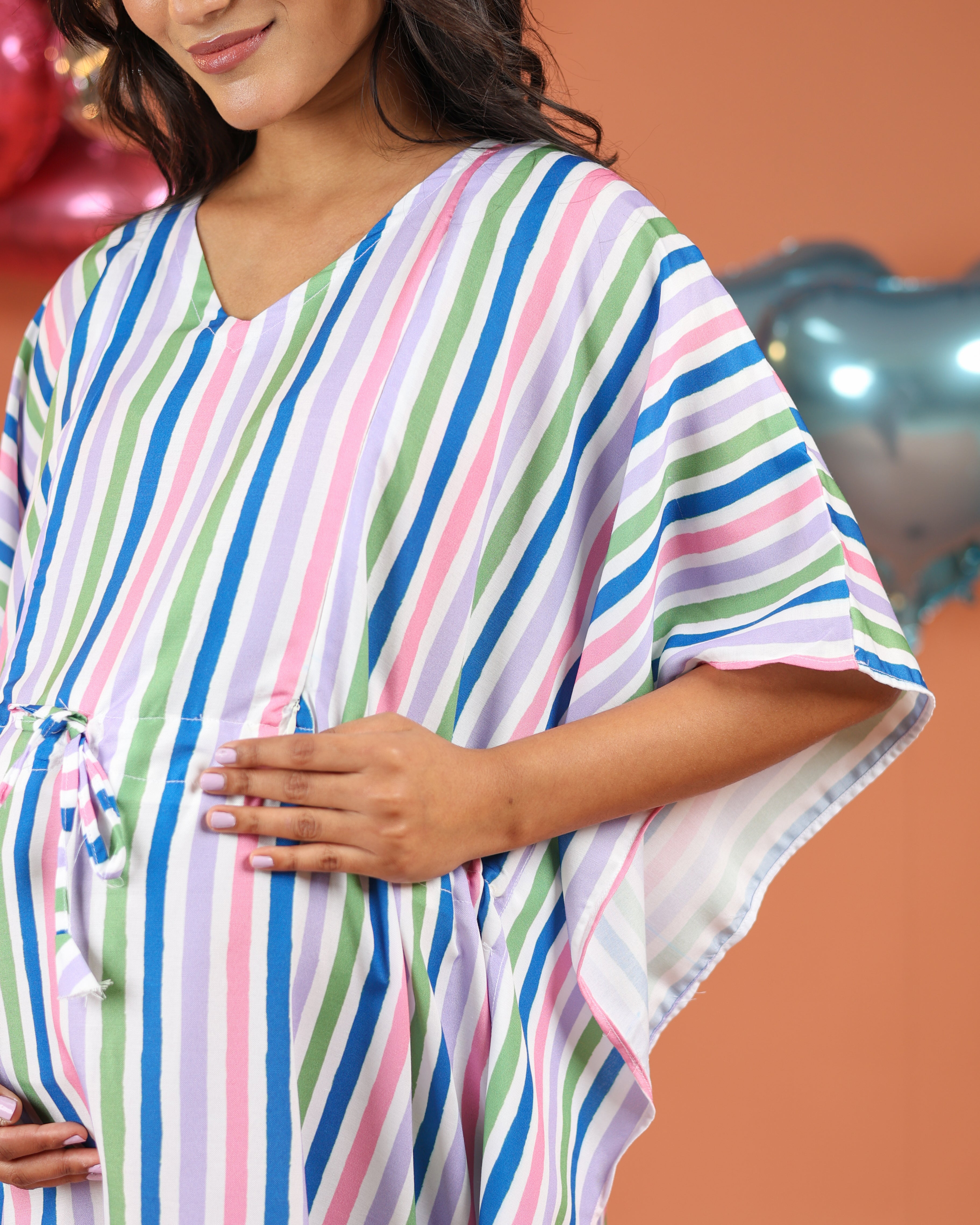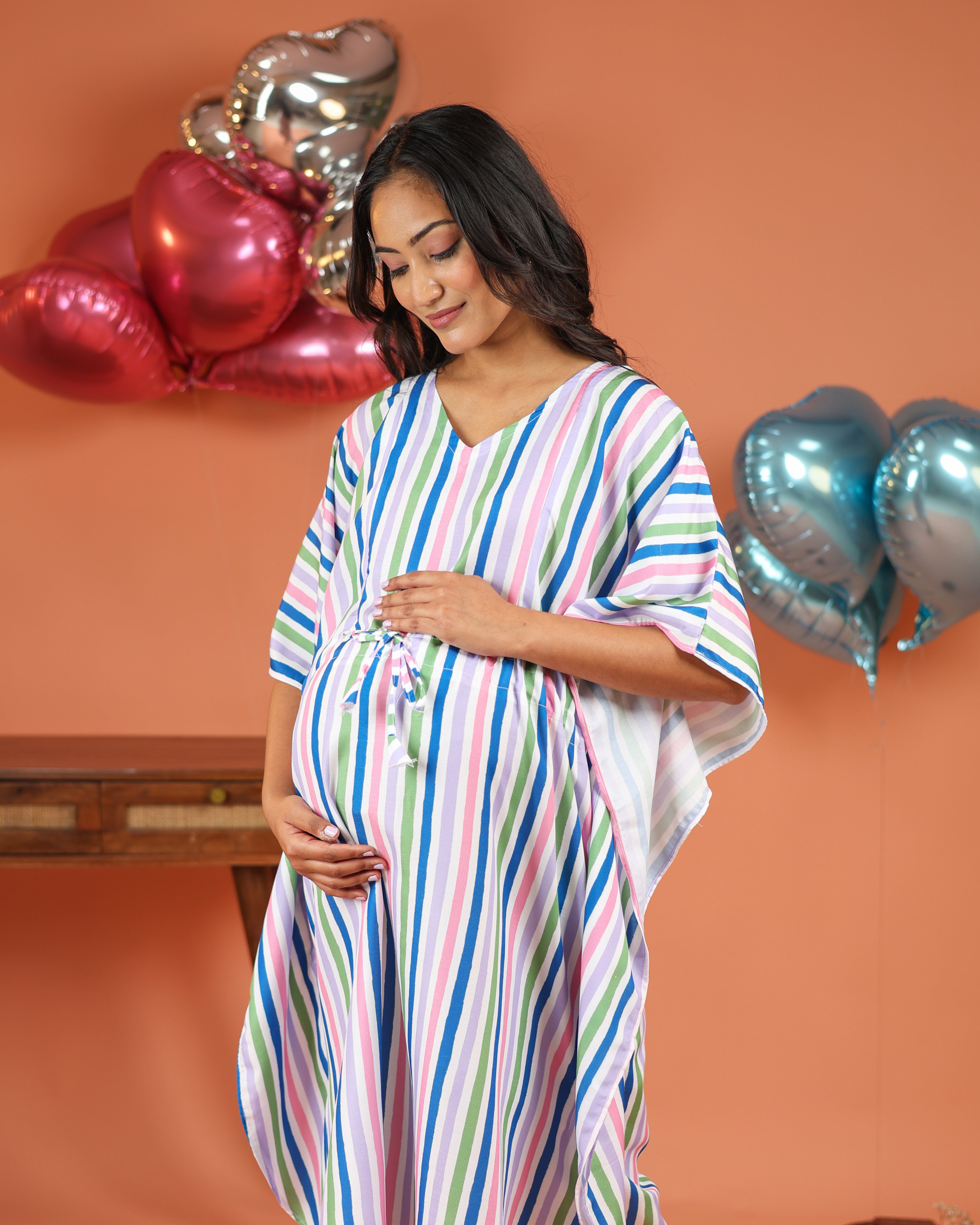 Brighten your day with Sola. This vibrant Kaftan features vertical pastel stripes that offer a flattering, elongated silhouette. The premium Rayon cotton blend is cool to the touch, and the discreet dual-zipper system makes it a functional must-have for your postpartum hospital bag.