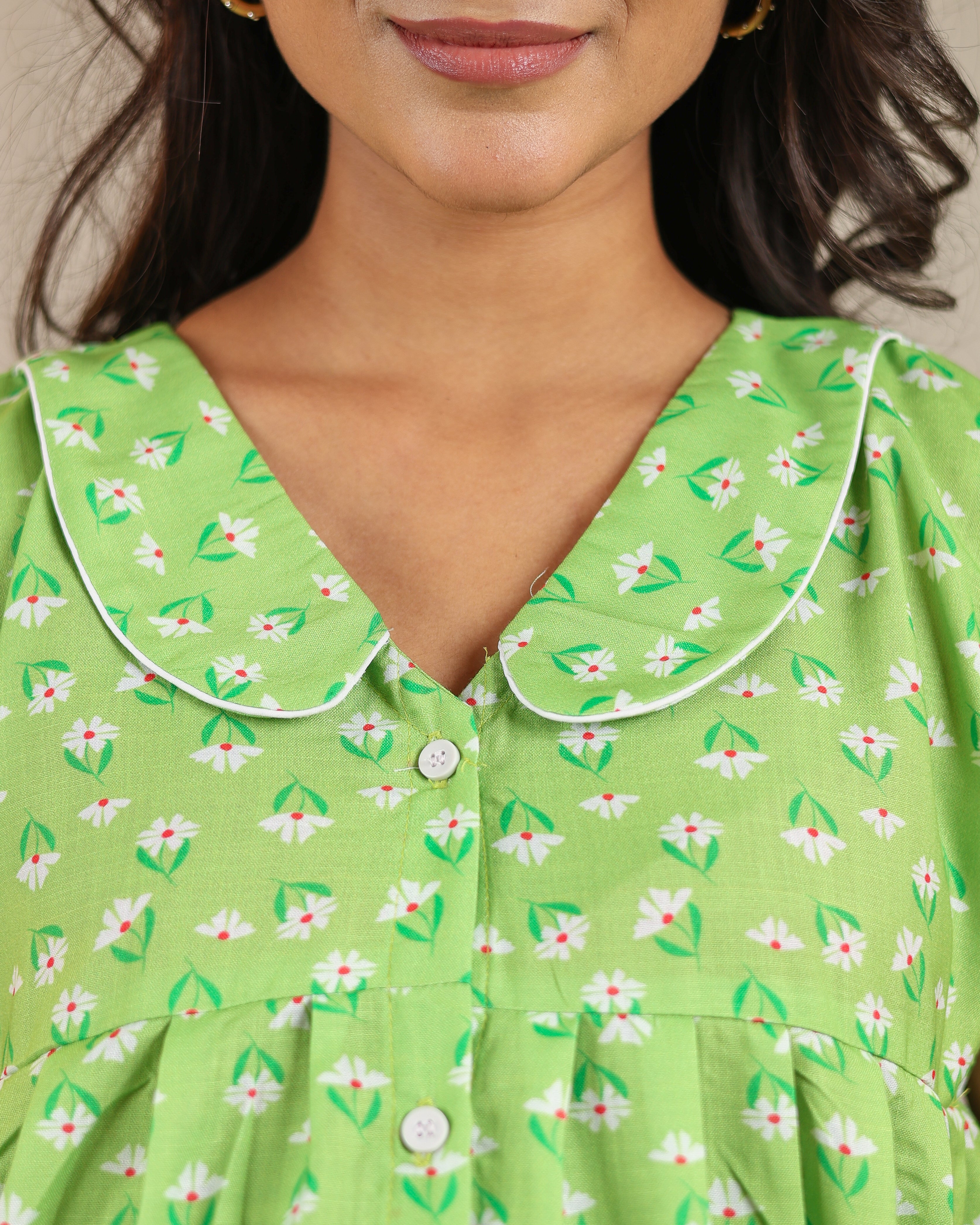 Feel fresh and vibrant in Meadow. Adorned with dainty white blossoms on a bright spring-green base, this dress is the epitome of "everyday joy." The functional button-down design makes it a postpartum favorite, offering a relaxed "free size" fit that adapts to your changing body.